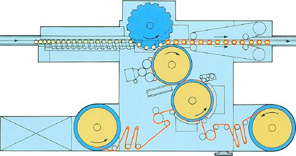 The guillotine cutting system was used in a lot of applications at that time, which system had disadvantages such as larger vertical movements or reciprocal movements causing a larger energy loss and the unit size was larger. On the contrary, rotary cutters employ rotating movement with less energy loss, allow to be a compact size and enable label infeed exceptionally higher. The first label infeed mechanism, however, was of intermittent label infeed.