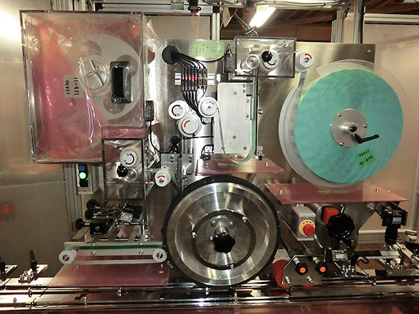 第3は、タックラベラー(シュリンクタックラベラーも含む)である(以下写真)。タックラベルとは、テープ状台紙にあらかじめ形抜きされたラベルシールが貼り付けられているものである。そのテープ状タックラベルが紙管に巻かれた一定の直径のロールタックラベルから、ラベルシールを剥離してラベルを供給し、容器にラベルを貼り付ける。いわば枚葉ラベル(カットラベル)をテープ状にしてラベルを供給するという枚葉ラベラーとロールラベラーの折衷形とも言うべきものだ。ロール状タックラベルを繰り出す工程と、ラベルを剥離する工程を有することが特徴である。