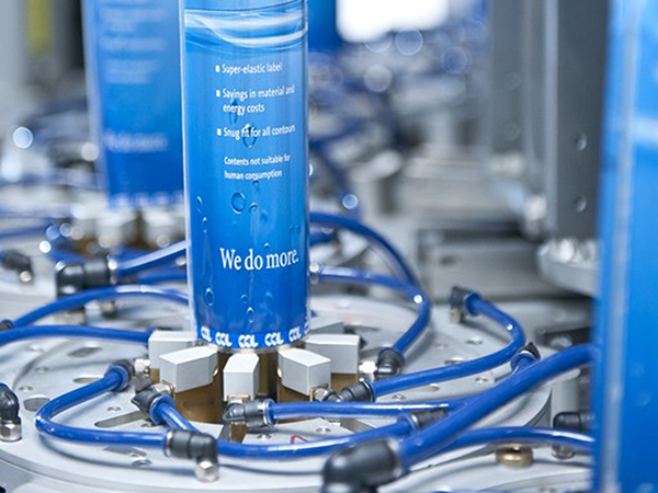 近年、伸縮性の高いラベル素材が開発され、凹凸の大きい容器にも使用されるようになってきている(ドイツのクロネス社、以下写真2枚目)。