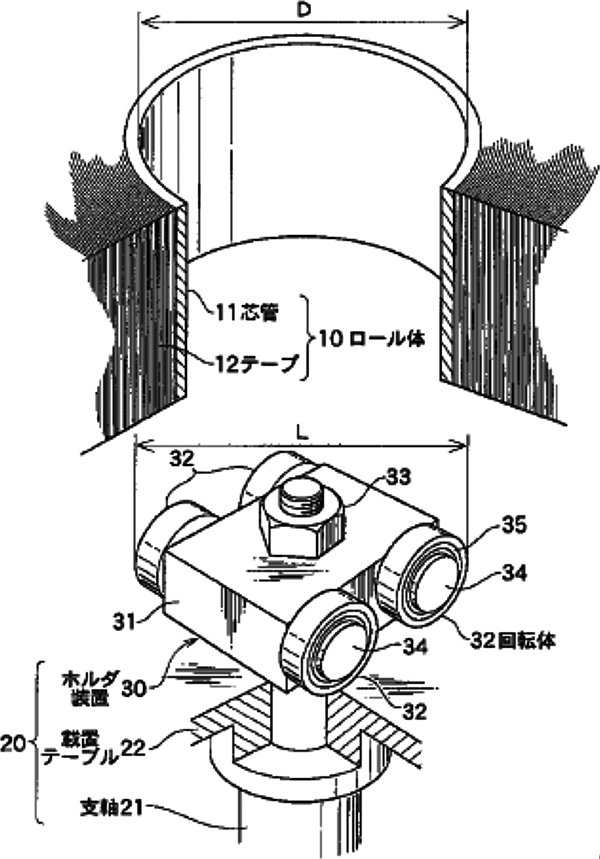 これまではラベルテーブルにロールラベルをセットした後に、ピン等によってロックする必要があった。先に述べたロールラベル自動供給装置にこの方式を用いることで、ラベルテーブルヘロールラベルを自動的にセットすることが容易になる(以下図、写真)。