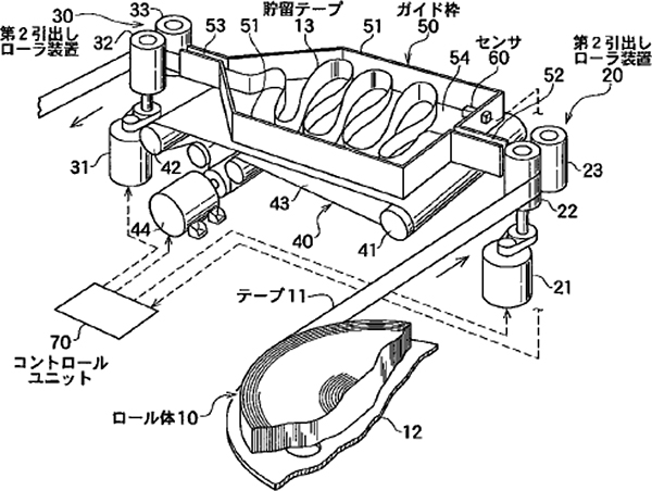 第2引き出しローラー装置(補助送り部)からバッファーコンベア(40)ヘロールラベルを引き出し、バッファーコンベア(40)にロールラベルをプールすることによって、第1引き出しローラー装置(ラベル繰り出し部)でのラベル張力が発生しない。これにより極薄フィルムのロールラベルの伸張を抑え、正確なラベルの切断が可能となったものだ(以下図、写真)。