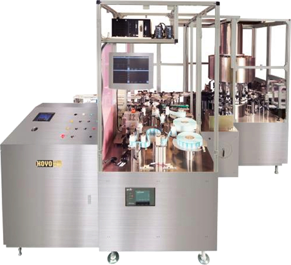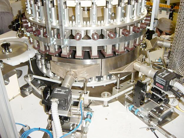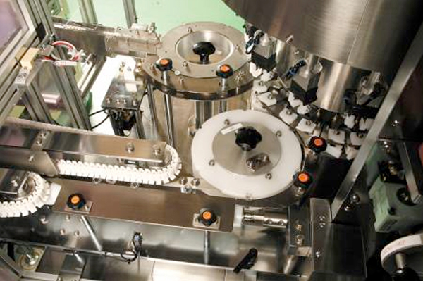 注射器組立機は、薬液充填の注射器のバレル部にプランジャロッドを装着してガスケットに巻き締めて組み込み、バックストップを装着して注射器を完成させる。各工程後にそれぞれ検査カメラで撮影されて検査し、不良品はラベリング前に排出される。その後に、タックラベラーが注射器のバレル部にラベルを貼り付け、ラベル貼付の検査を行い不良品は排出される。注射器組立機の前工程として、プランジャロッド供給機とバックストップ供給機を備える。