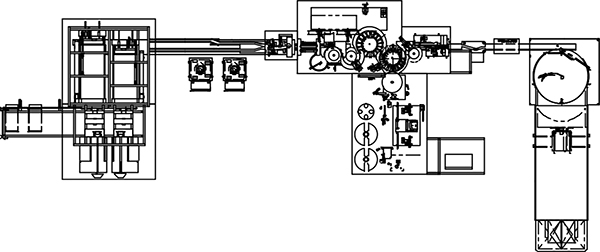 各装置がコンベアによって連結されたラインは、容器の供給から始まって容器の側面と天面にラベリングし、ラベル貼付容器を集積してトレーに収納し、搬出されるまでの工程で終結する。タックラベルを貼り付け検査された最終製品の容器は、集積装置内に搬送され一定数ごとに整列させトレーヘ収納し完了するとコンベアにより搬出される(以下写真、図)。