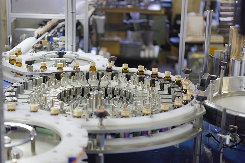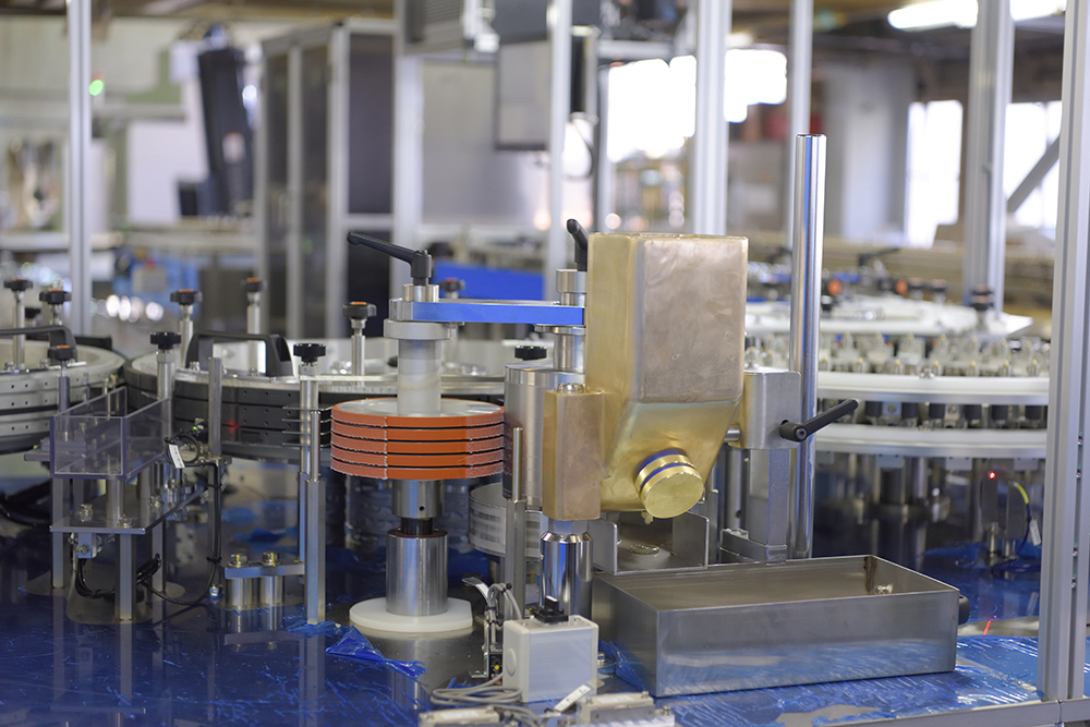 ロータリー内で容器を1本ずつチャッキングし、搬送を行います。多点張りや駆動をサーボモータにすることで、ラベルの巻き付け強度の調整が可能です。