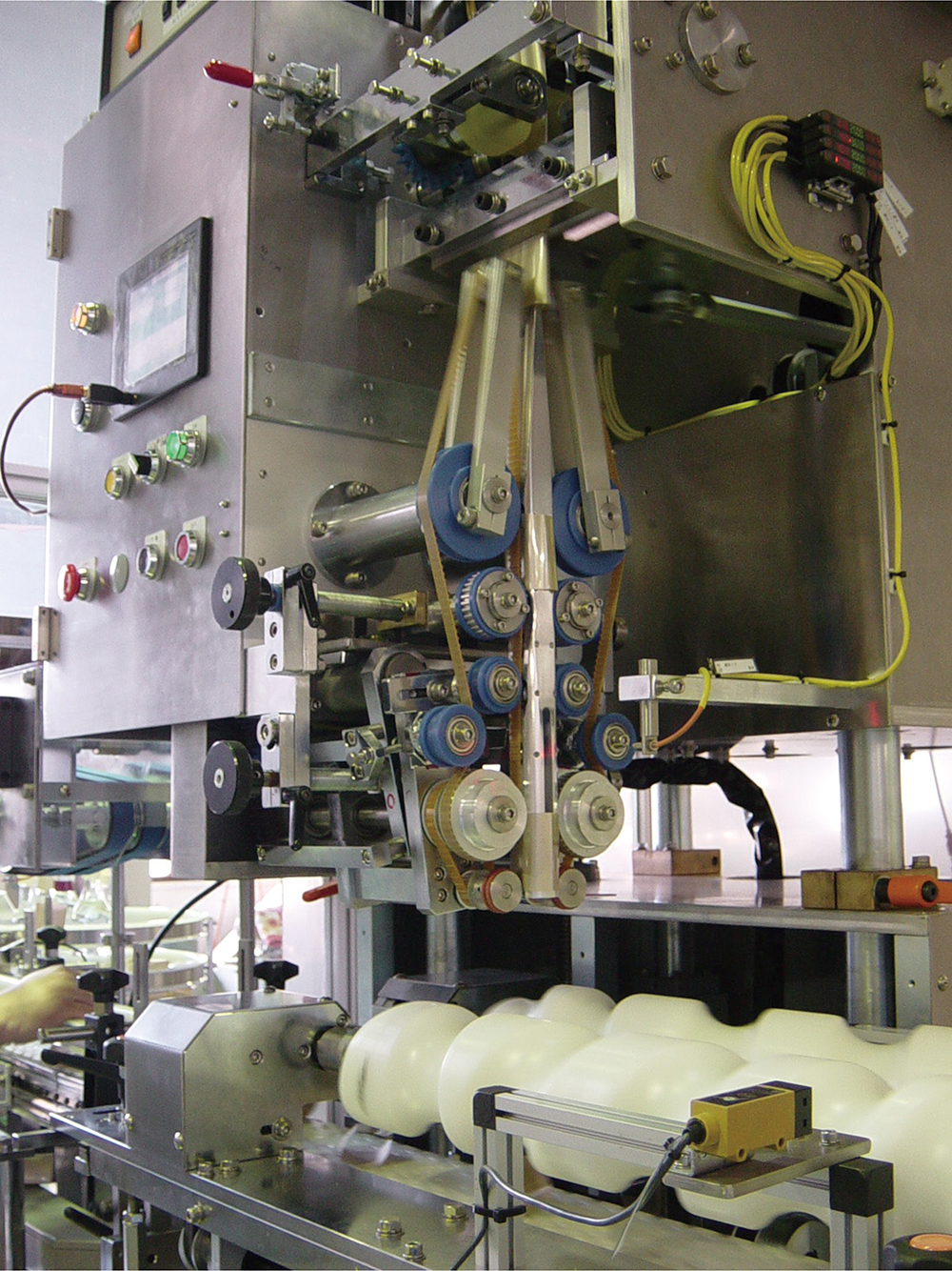 シュリンクフィルムラベルをカットし、開いてボトルに装着するラベリング方式の機械です。