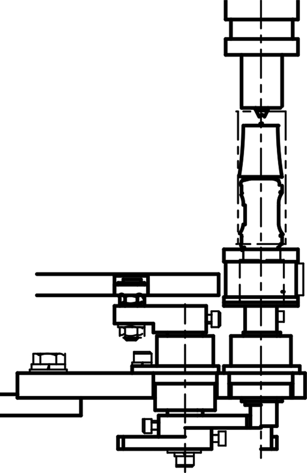 The first challenge was the fact that eye drop containers were not cylindrical round bottle. The second was the label overlapped up to the top surface of the cap. This prevented label application using the conventional method available at that time. To overcome these challenges, it was necessary to insert a hollow bobbin into the undefined shape cap to make a round body portion while the container was being transferred with the turret rotary unit. This was to put a non-adhesive processed bobbin of the same diameter as the container on the irregular shaped head of the container and press the bobbin against it, make the container and the bobbin one-piece, around which a shrink tack label was wrapped around to apply at the application rotary assembly (Photos and diagrams below).