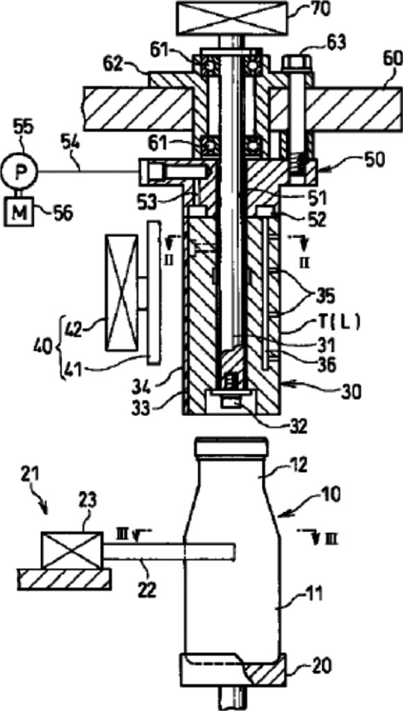 Thirdly, it was necessary to align label directions with the direction of undefined shape containers with dimples. Containers must face in the same direction to apply labels and therefore directions must be limited before application. This problem was solved with the technology of the patent, “Direction limiting unit for lightweight containers with dimples” described before (2nd photo below).