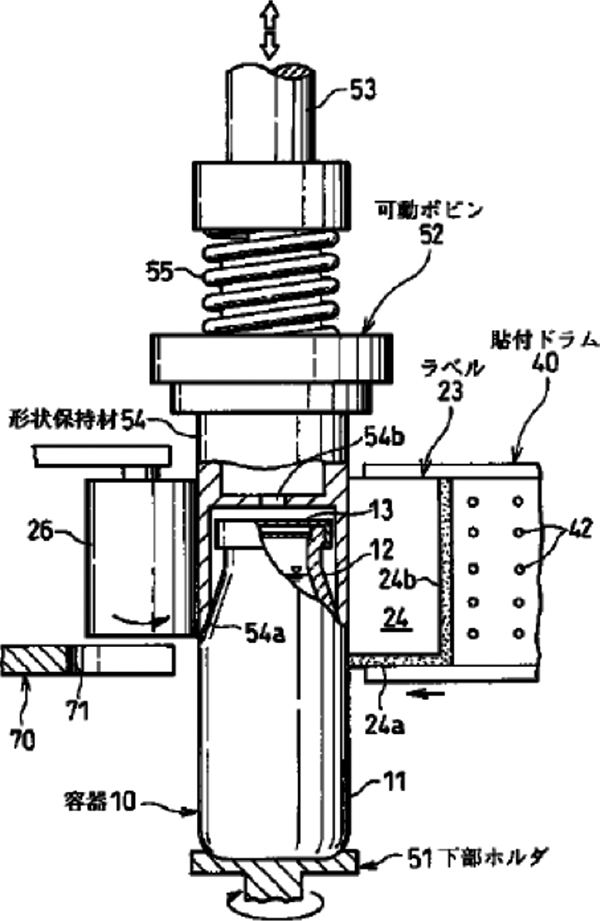 A tape shaped shrink label is wrapped around the forming bobbin and joined to form a sleeve shrink label, which then is lowered to put over a container. Then the label is heated to shrink to close-fit to the container. This drastically reduces label costs and contributes container recycling as well (2nd picture below).